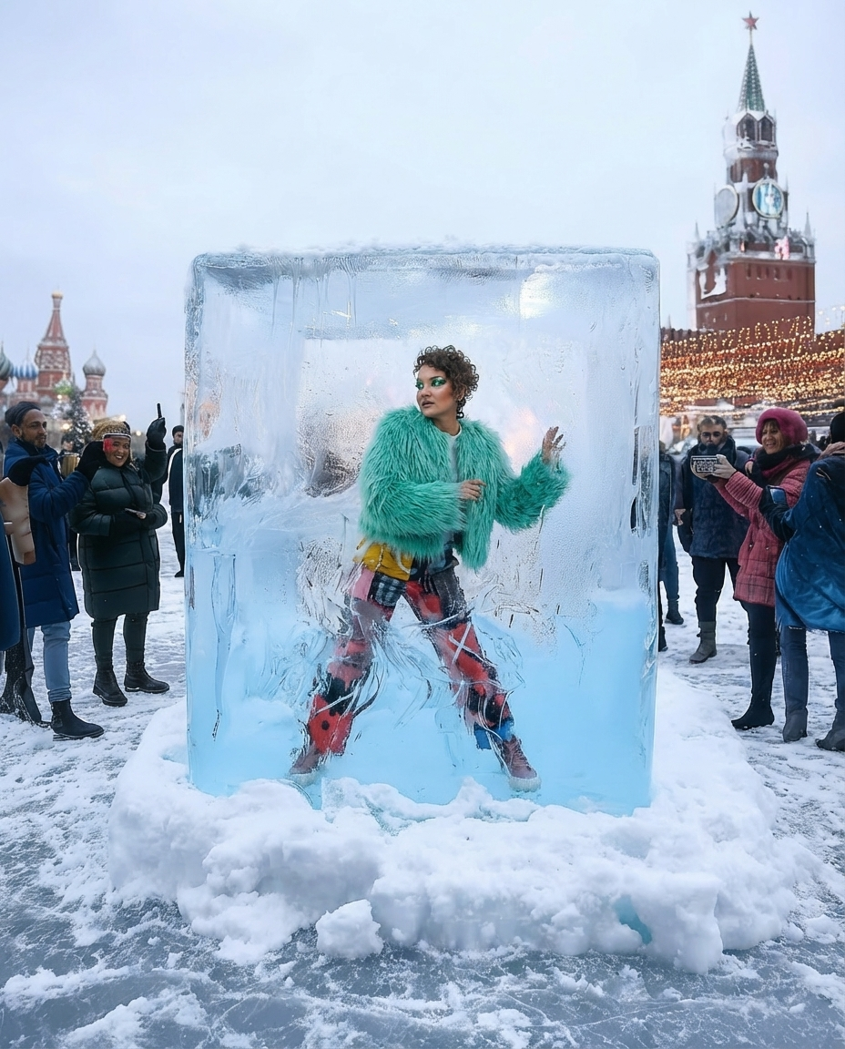 Создай изображение, чтобы модель была полностью в большом куске льда, внизу льдинки и снег, сделай максимально реалистично. Сохрани черты лица, не меняй одежду и позу человека. Фигура модели реалистичного размера, как будто бы человека, идущего по улице, внезапно заморозили. Вокруг фигуры на разном удалении стоят зеваки: с удивлением смотрят на куб, показывают пальцем или снимают на телефон. На фоне [снежная Красная площадь, видно храм Василия блаженного и Кремль]. Измени освещение и сделай цветокоррекцию, чтобы модель в кубе максимально реалистично вписывалась в окружающий пейзаж.